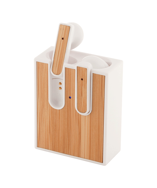 Wireless bluetooth earphones with bamboo inlay and hands-free call function.