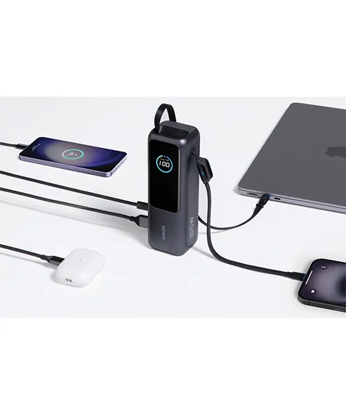 Отличителна черта на тази батерия са двата вградени USB-C кабела. Единият е прибиращ се, а другият е интегриран в здрава каишка за носене. Това практично решение елиминира нуждата от допълнителни кабели във Вашия багаж. Устройството позволява едновременно зареждане на до четири устройства чрез допълнителни портове. Интелигентният дигитален дисплей предоставя информация в реално време за мощността и състоянието на батерията.