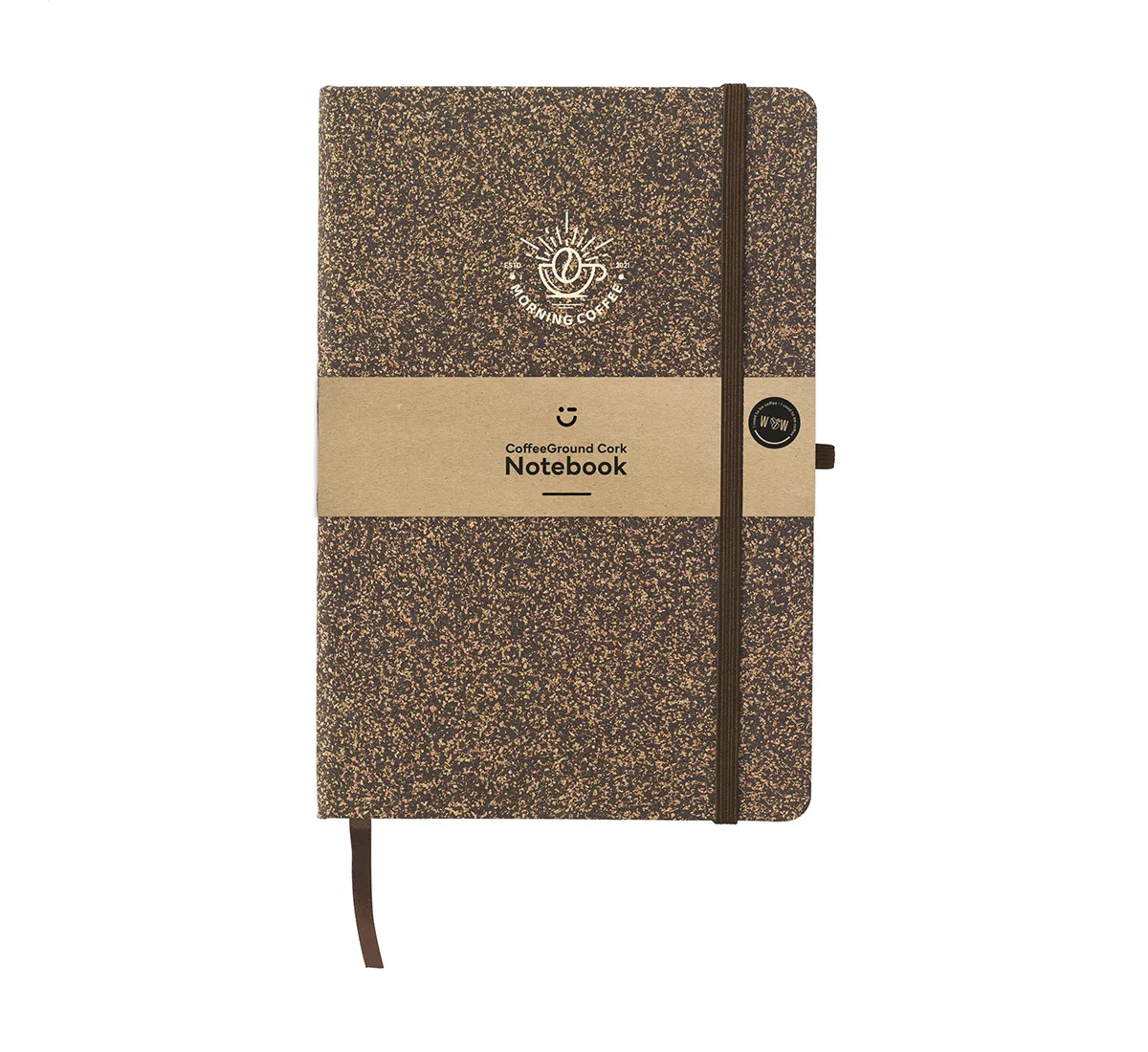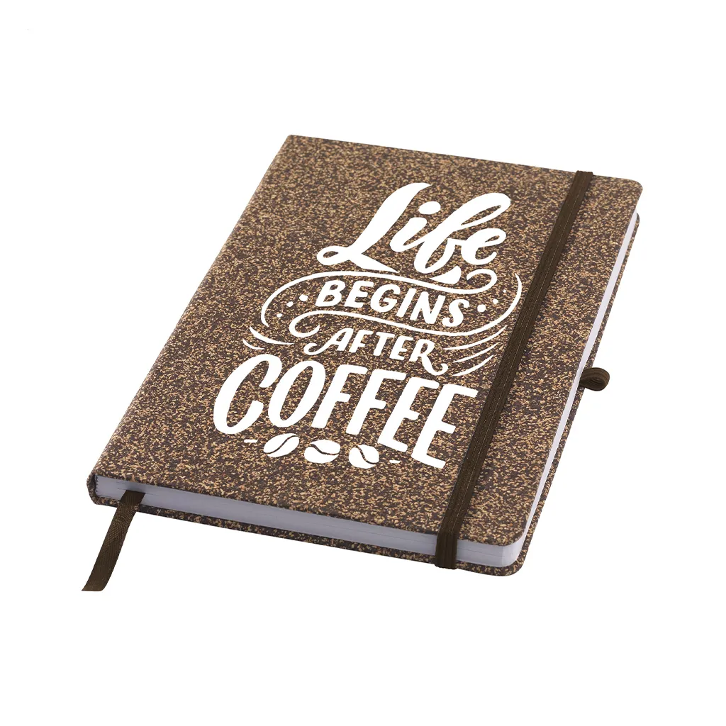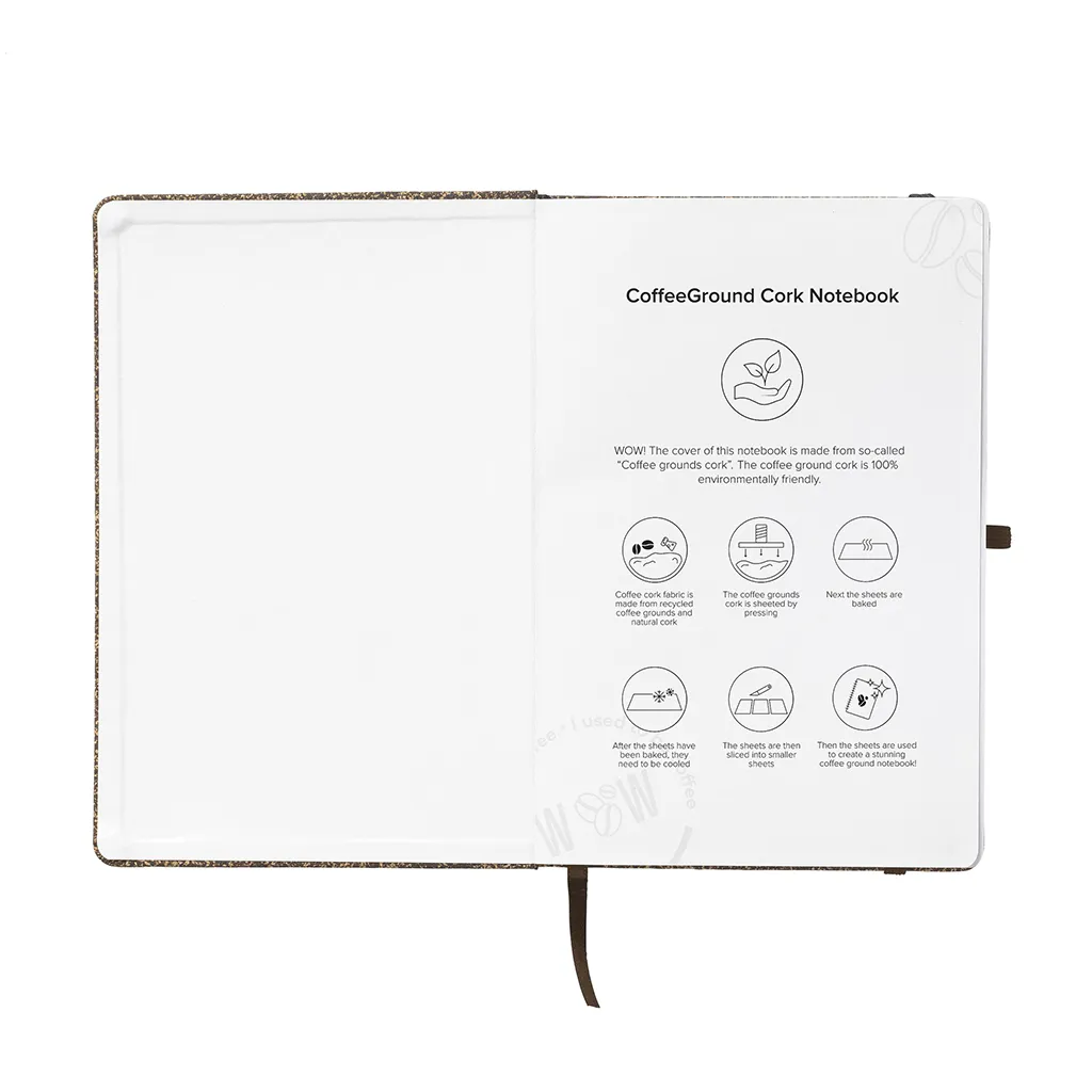 Тефтерът от кафе WoW A5 впечатлява с иновативен дизайн и естествена текстура. Корица от FSC Mix сертифициран картон е покрита със смес от утайка от кафе, корк, полиестер и памук. Всеки екземпляр има уникален цвят и структура, вдъхновени от природните материали. Форматът A5 е удобен за ежедневна употреба, а здравата корица предпазва страниците от износване. Вътрешността съдържа 96 листа (192 страници) от рециклирана FSC Mix сертифицирана хартия на редове. Тефтерът включва еластична лента за затваряне, отметка и държач за химикалка. Всеки детайл е създаден с мисъл за удобство и дълготрайност.