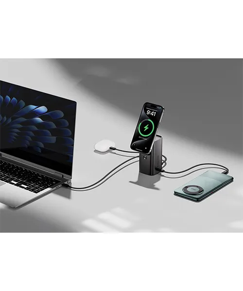 Една от отличителните черти на преносима батерия Urban Vitamin Sunnyvale 15 000 mAh е интегрираната 15W магнитна безжична поставка за телефон. Тя позволява едновременно безжично зареждане и удобна позиция за hands-free използване, което е перфектно за видео разговори, стрийминг или навигация. Освен безжичното зареждане, устройството предлага два USB-C порта и един USB-A порт, позволяващи зареждане на до четири устройства едновременно.