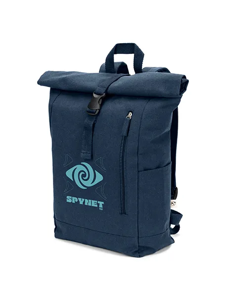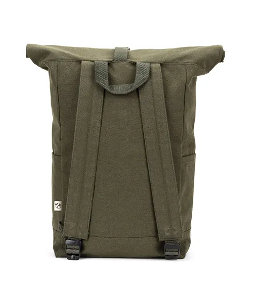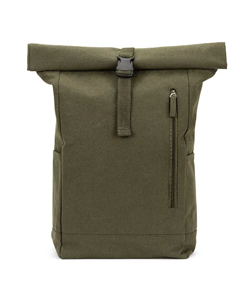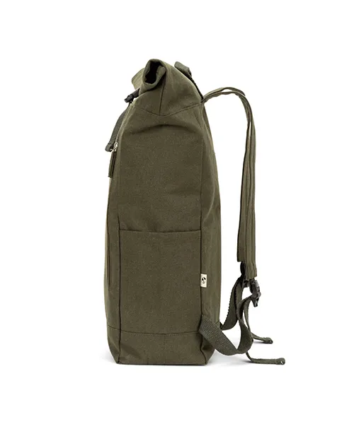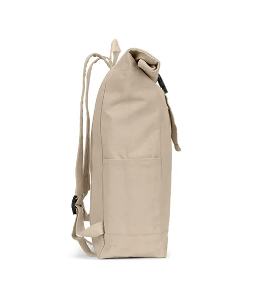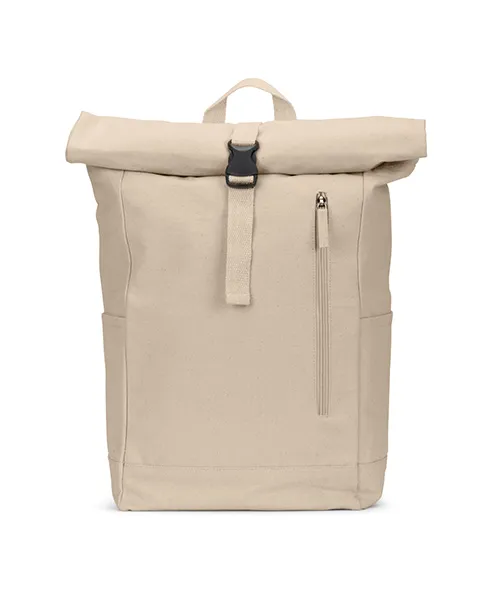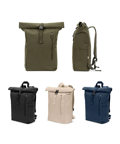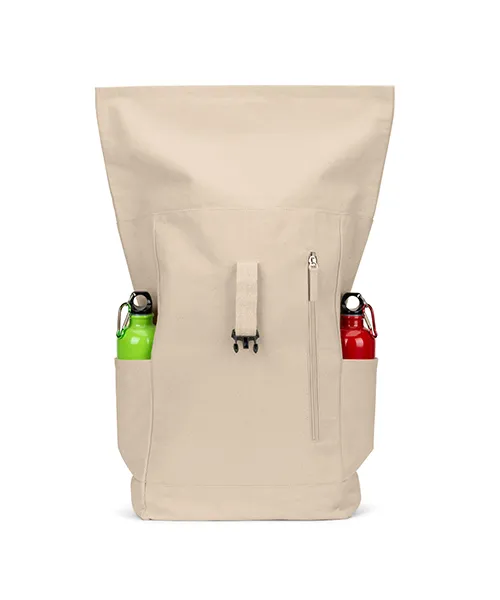 Раница с ролково затваряне е изработена от рециклиран памук и рециклиран полиестер с плътност 380 g/m². Материалът е здрав, устойчив и подходящ за ежедневна употреба, като същевременно остава издръжлив и плътен. Рециклираният памук се използва в естествения си цвят, без боядисване и избелване. Производственият процес не включва химикали за обработка, което намалява въздействието върху околната среда и подкрепя по-отговорен избор.