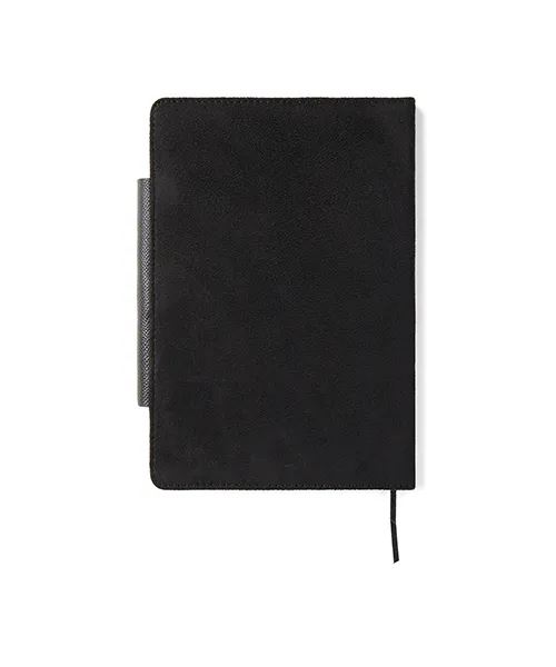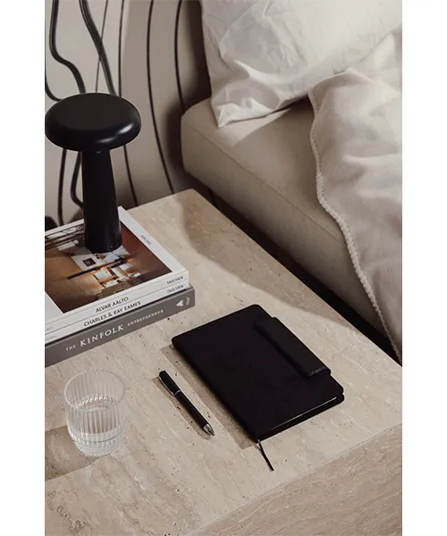 Покритието на Тефтер VINGA Marlow е изработено от прецизна комбинация от изкуствен велур и рециклирана кожа. Тези материали му придават луксозно усещане при допир и модерен, минималистичен вид. Интегрираното магнитно затваряне осигурява пълна сигурност на Вашите записки и предпазва страниците от повреда. Вграденият държач за химикалка гарантира, че винаги ще имате своя инструмент за писане под ръка. Всеки елемент от дизайна е проектиран да носи удобство и да подчертава Вашия професионален стил. Твърдата корица осигурява стабилност и защита на Вашето съдържание при ежедневно пренасяне.
