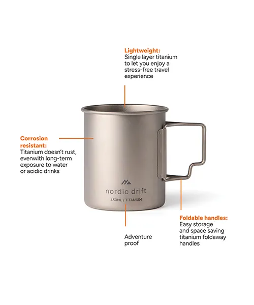 Ултралека титаниева чаша Nordic 450 мл е създадена като надежден спътник за активен начин на живот, където лекотата, здравината и функционалността работят заедно без компромис.