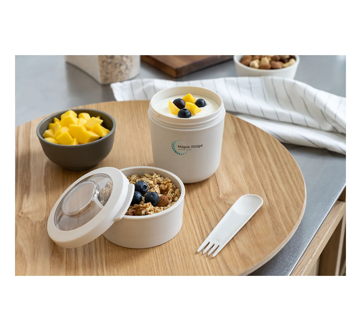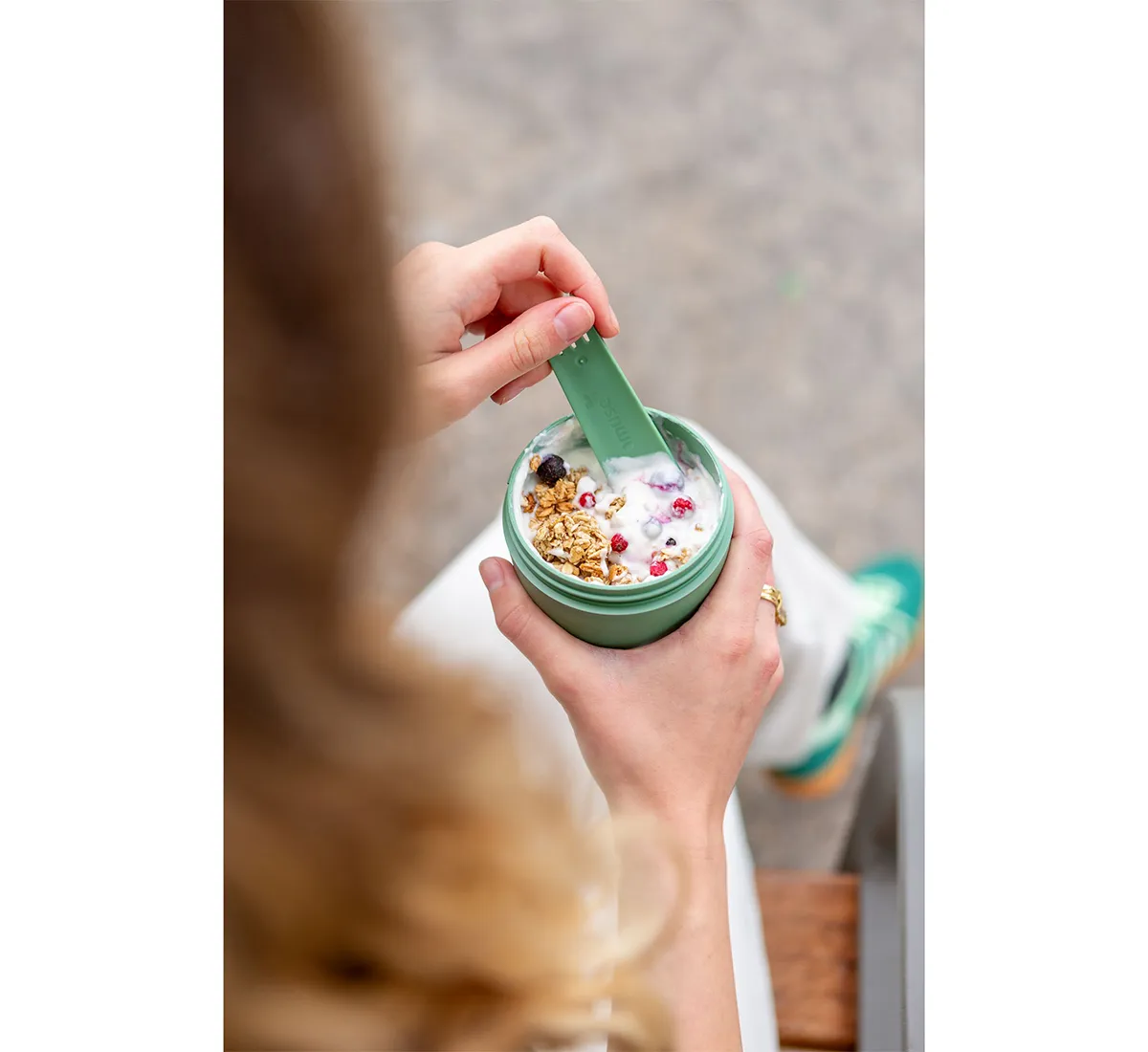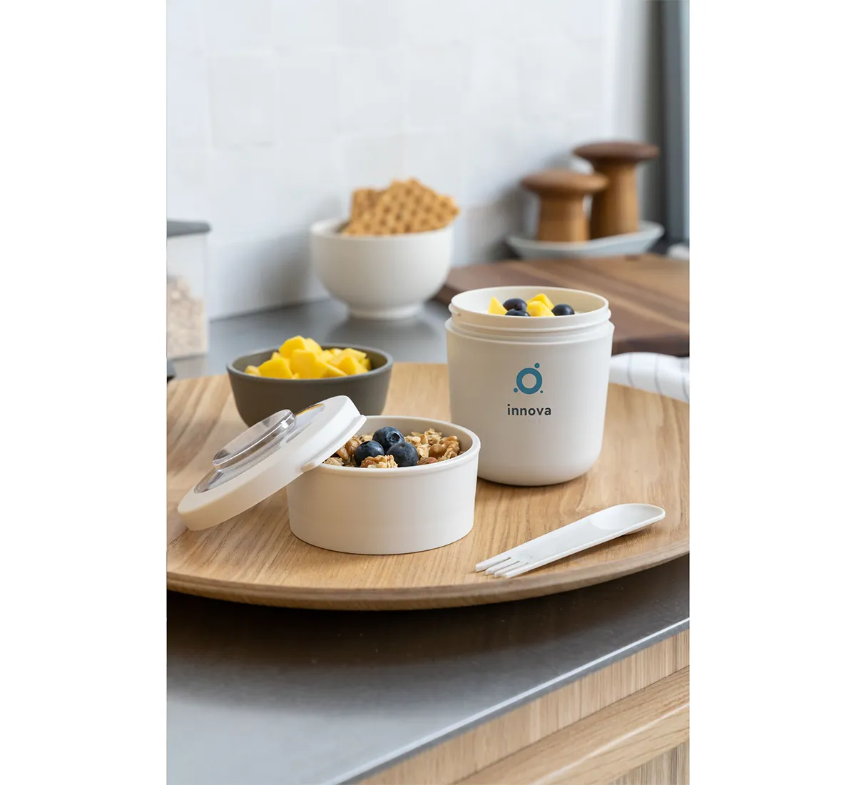 Tylla Duo съчетава естетика и функционалност. Горният контейнер е подходящ за плодове, ядки или зърнени храни, а долният контейнер за кисело мляко, извара или други основни ястия. Това осигурява гъвкавост и удобство за различни хранения през деня. Моделът е изключително подходящ за работа, училище, излети или пътувания, като запазва храната свежа и лесно достъпна.