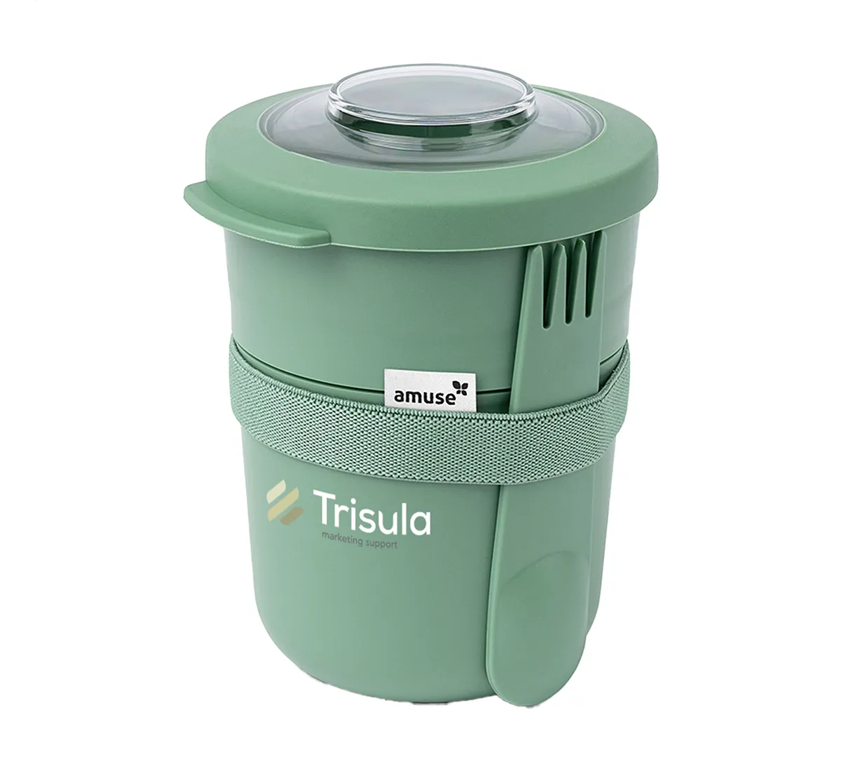 Комплектът включва пластмасова вилица и лъжица в едно, както и еластична лента за допълнителна сигурност при транспортиране. Материалите са безопасни, издръжливи и устойчиви на ежедневна употреба. Моделът е подходящ за микровълнова без капака, за фризер и за съдомиялна до 65°C. Ръчното миене се препоръчва, за да се запази отпечатъкът и цветовете на продукта.